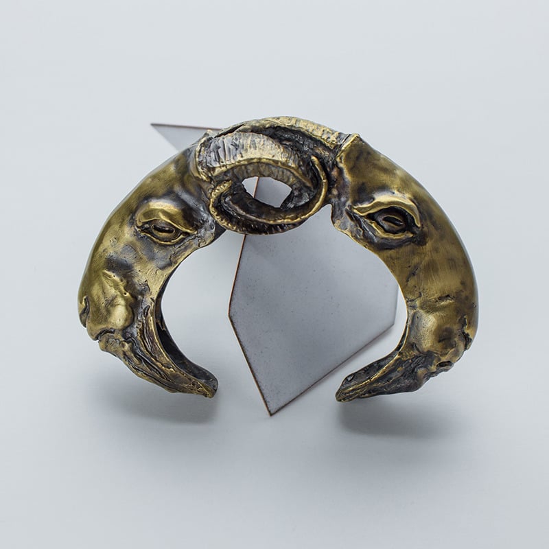 A seriously sculptural cuff that is sure to be a conversation piece no matter what you wear this with. Two intertwined goat's heads with hollow interior, made from cast brass with satin finish. Hollow metalwork makes this piece much lighter than it's heavy duty look. The oval interior allows for a comfortable fit on most wrists, however this piece is not bendable, if you have sizing questions please be in touch and we can assist you measuring your wrist for proper fit.